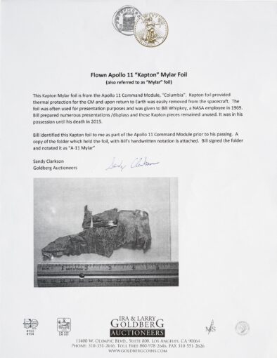 2. Apollo 11 Flown Kapton Foil Large Piece 1×1.5 Inches #HA-50254-D1