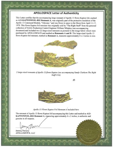 2. Apollo 13 Flown Kapton Foil Large Piece 6×2 Inches #RS2-A