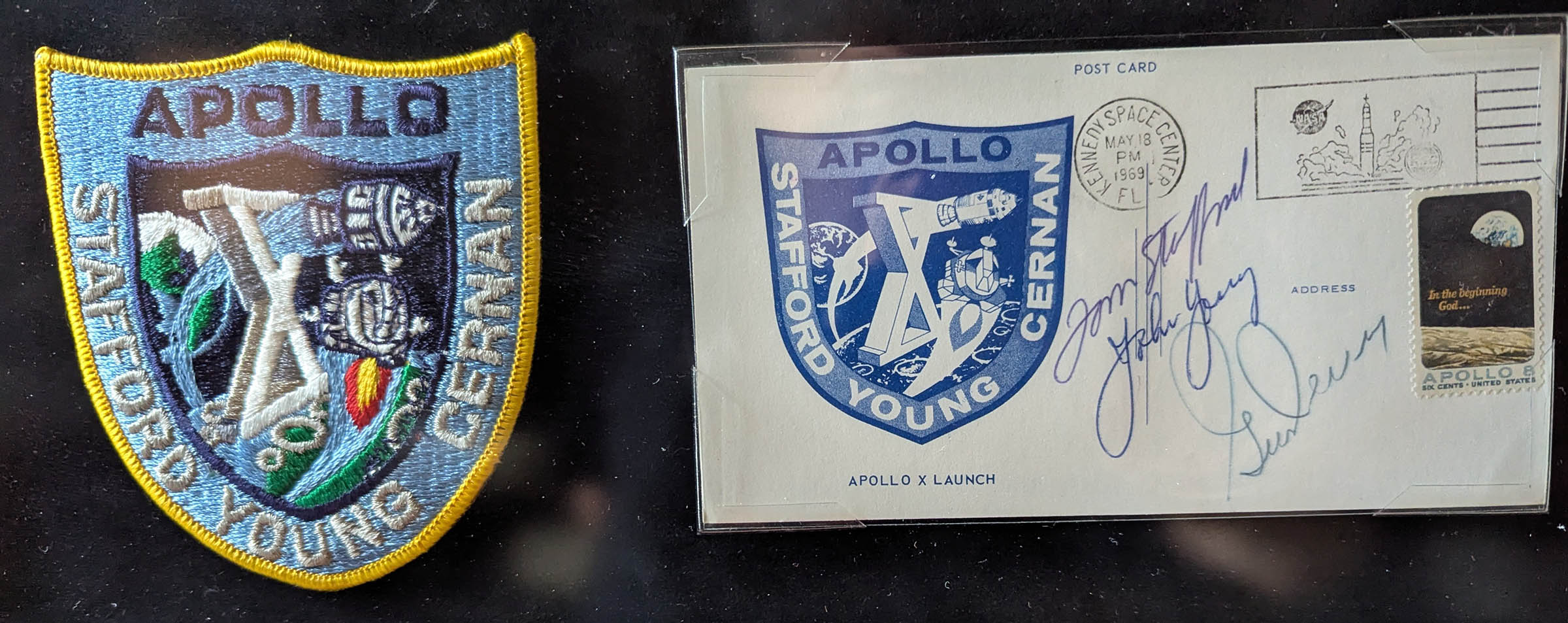 Apollo 10 crew signed #6 size post card archivally matted and framed with an Apollo 10 patch and crew photograph.