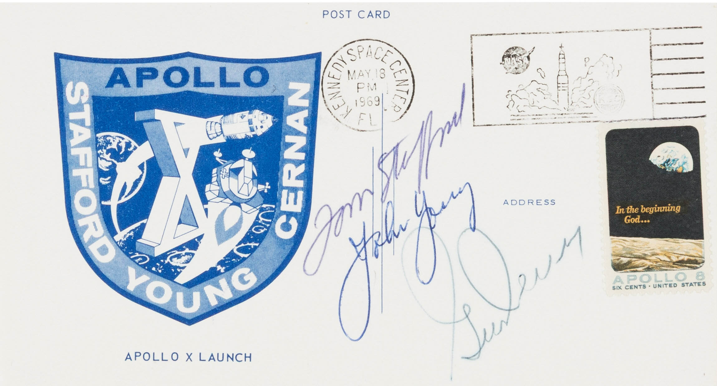 Apollo 10 crew signed #6 size post card featuring a mission insignia cachet, bearing a 6¢ “Apollo 8” stamp pictorially machine canceled at Kennedy Space Center on May 18, 1969. Signed “Tom Stafford”, “John Young”, and “Gene Cernan”. Archivally matted and framed with an Apollo 10 patch and crew photograph. Excellent condition.