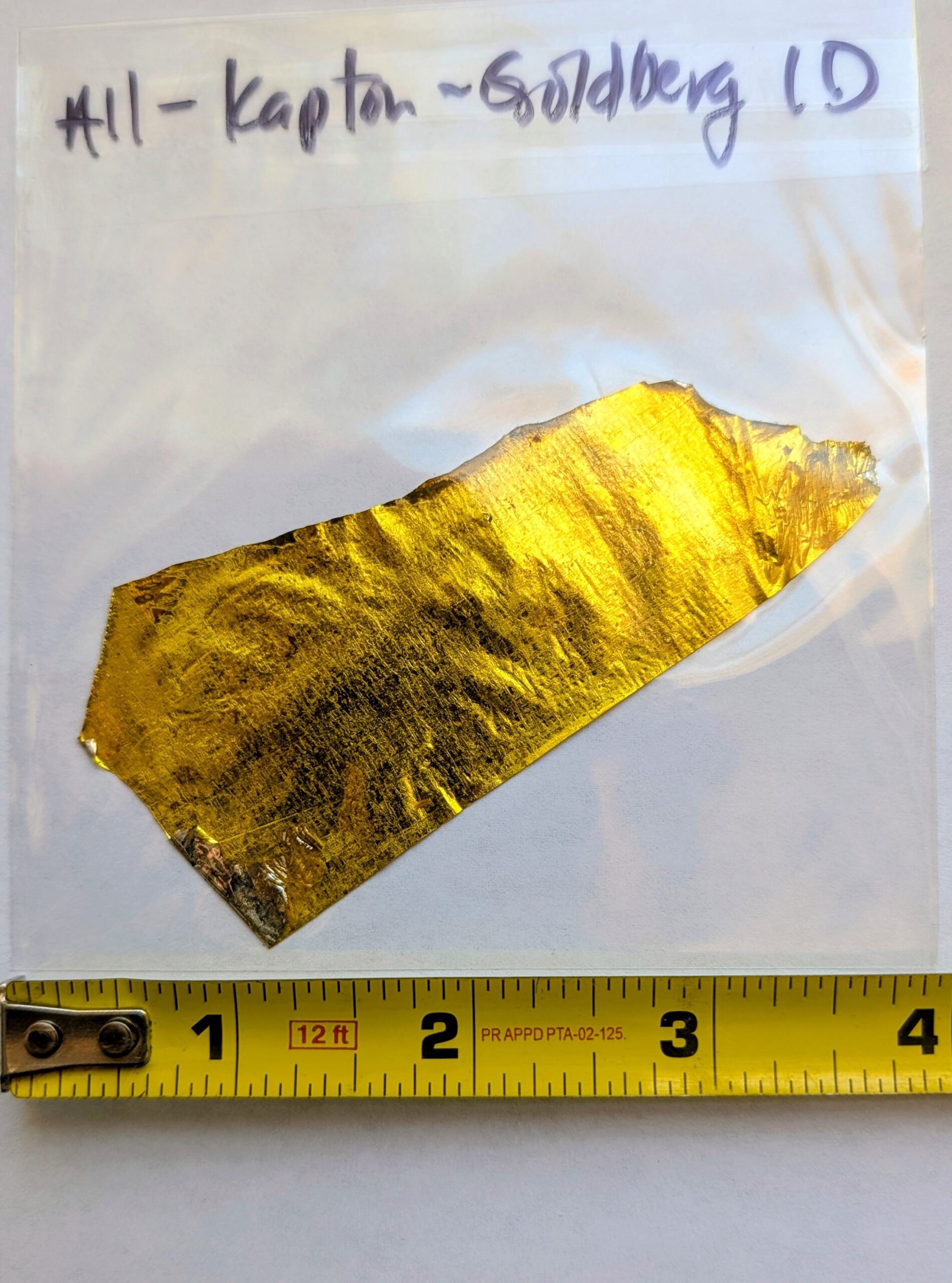 Large-sized Apollo 11 flown Kapton foil remnant, A11-KaptonFoil-GOLDBERG-D, measuring approximately 3.5 x 1.5 inches in size.
