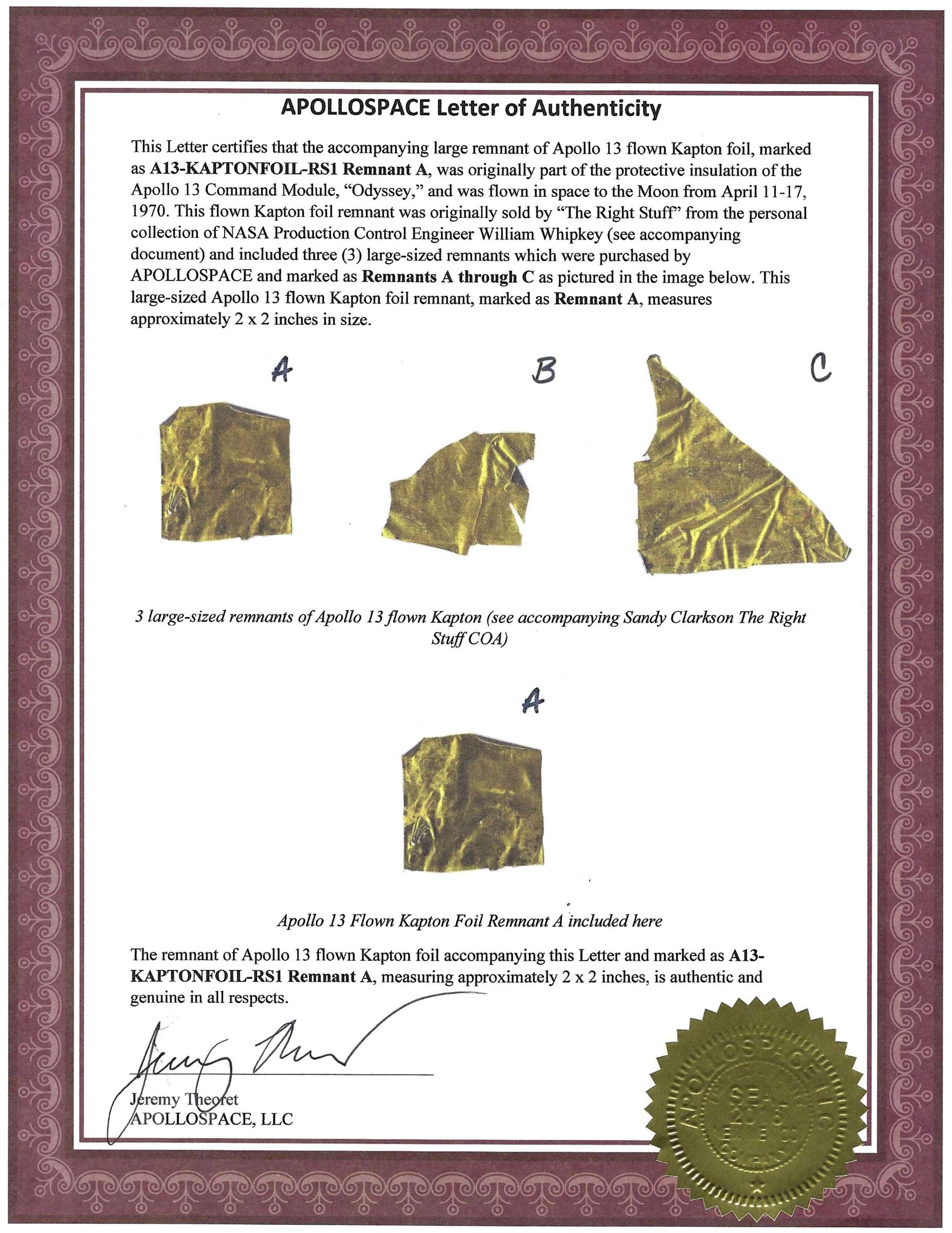 This large remnant of Apollo 13 flown Kapton foil, A13-KAPTONFOIL-RS1-A, was originally part of the protective insulation of the Apollo 13 Command Module, “Odyssey,” and was flown in space to the Moon from April 11-17, 1970. This flown Kapton foil remnant was originally sold by “The Right Stuff” from the personal collection of NASA Production Control Engineer William Whipkey (see accompanying images) and included three (3) large-sized remnants which were purchased by APOLLOSPACE and marked as Remnants A through C as pictured in the gallery images. This large-sized Apollo 13 flown Kapton foil remnant, A13-KAPTONFOIL-RS1-A, measures approximately 2 x 2 inches in size. Full provenance documentation from APOLLOSPACE.