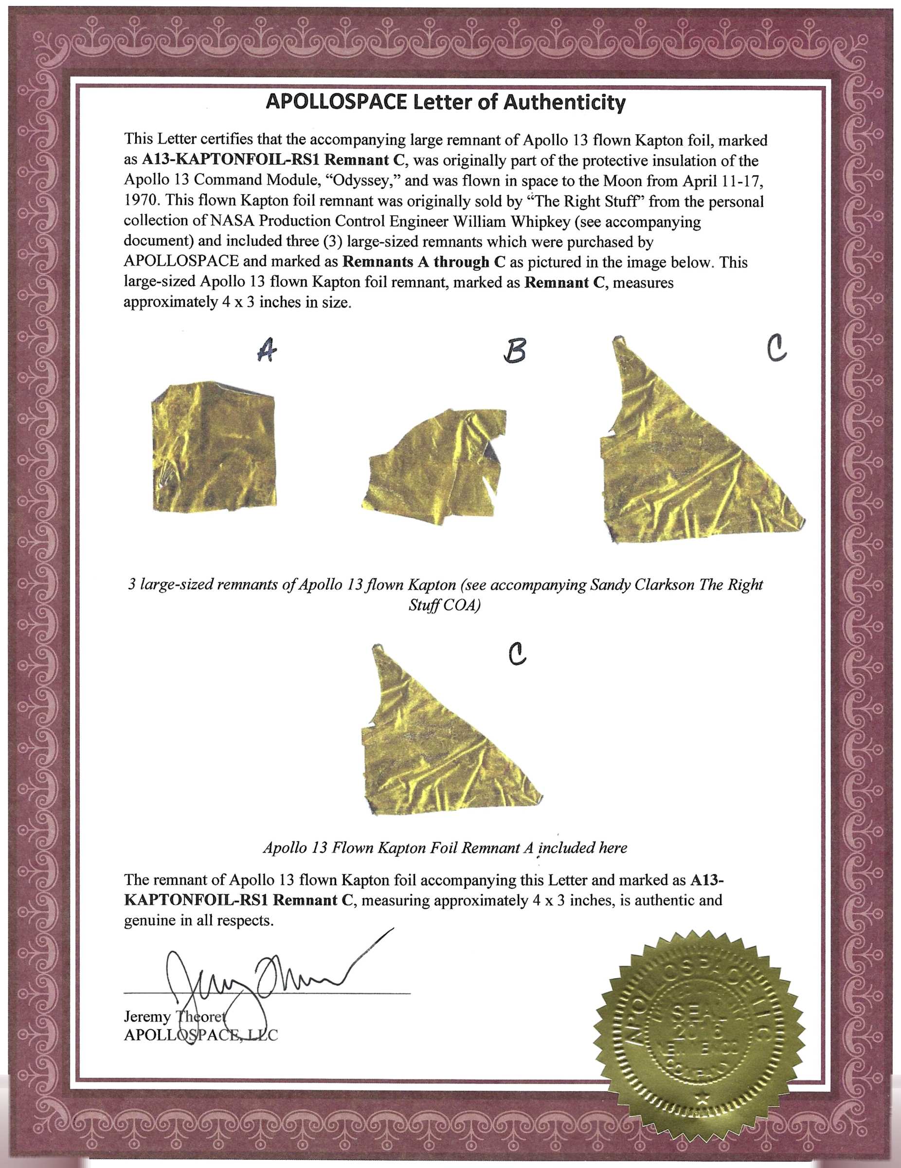 This large remnant of Apollo 13 flown Kapton foil, A13-KAPTONFOIL-RS1-C, was originally part of the protective insulation of the Apollo 13 Command Module, “Odyssey,” and was flown in space to the Moon from April 11-17, 1970. This flown Kapton foil remnant was originally sold by “The Right Stuff” from the personal collection of NASA Production Control Engineer William Whipkey (see accompanying images) and included three (3) large-sized remnants which were purchased by APOLLOSPACE and marked as Remnants A through C as pictured in the gallery images. This large-sized Apollo 13 flown Kapton foil remnant, A13-KAPTONFOIL-RS1-C, measures approximately 4 x 3 inches in size at widest. Full provenance documentation from APOLLOSPACE.