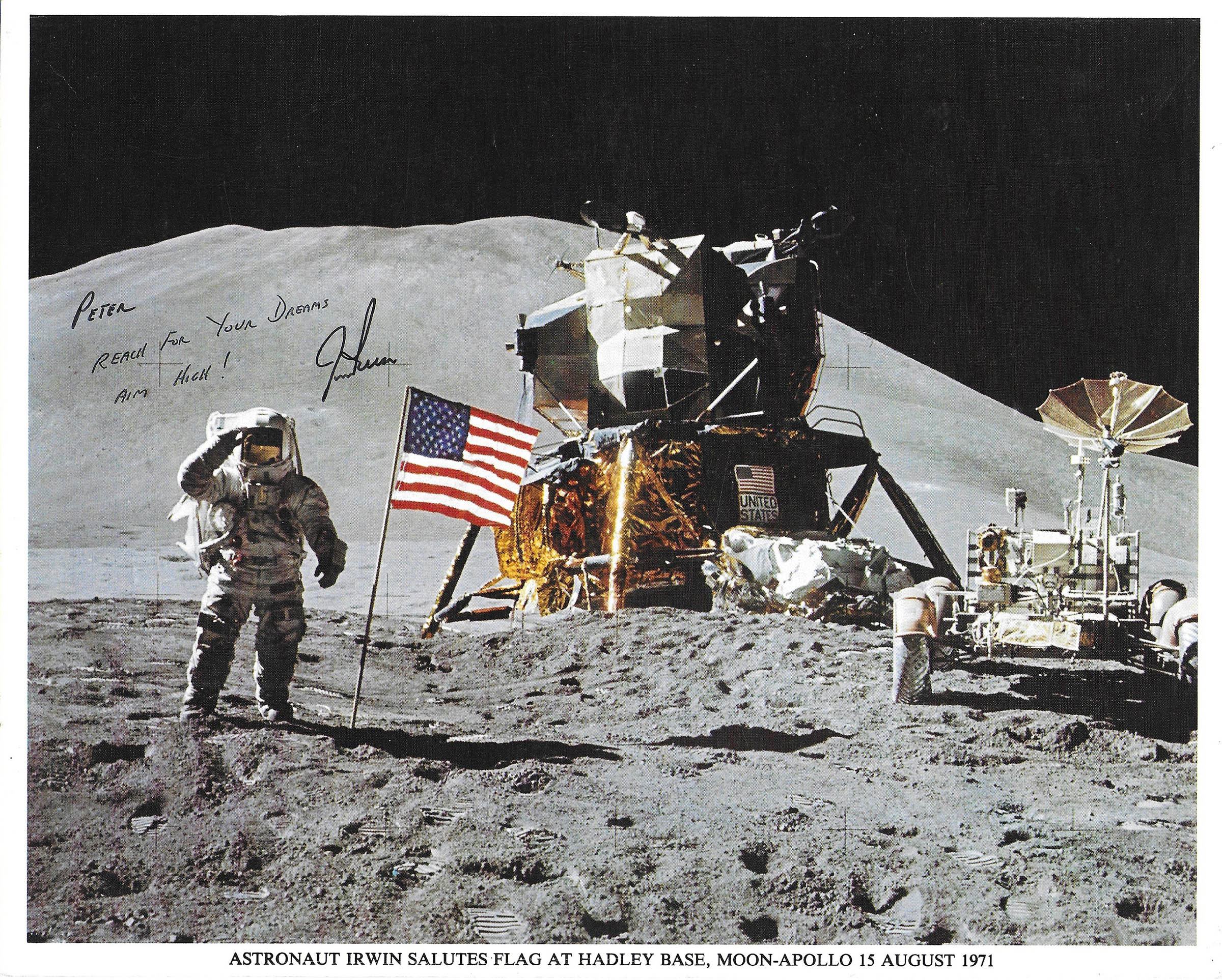 Apollo 15 Moonwalker Jim Irwin signed color 8×10 lithograph of Irwin on the lunar surface saluting the US flag. Hand-signed “Jim Irwin” and personalized to “Peter” with pre-printed inscription: Reach for your dreams aim high! Corner bumps and edge wear. Reverse shows tape removal vestiges.