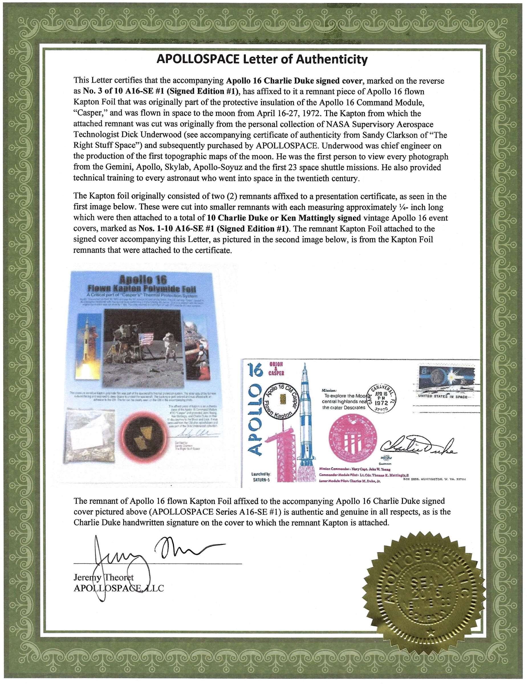 APOLLOSPACE is pleased to offer a collection of Apollo 16 Astronauts Charlie Duke or Ken Mattingly signed Apollo 16 event covers which have been affixed with a remnant piece of Apollo 16 Kapton foil that was originally part of the protective insulation of the Apollo 16 command module “Casper,” and was flown in space to the moon from April 16-7, 1972. The Kapton from which the attached remnant was cut was originally from the personal collection of NASA Supervisory Aerospace Technologist Dick Underwood (see accompanying certificate of authenticity from Sandy Clarkson of “The Right Stuff Space”) and subsequently purchased by APOLLOSPACE. Underwood was chief engineer on the production of the first topographic maps of the moon. He was the first person to view every photograph from the Gemini, Apollo, Skylab, Apollo-Soyuz and the first 23 space shuttle missions. He also provided technical training to every astronaut who went into space in the twentieth century.