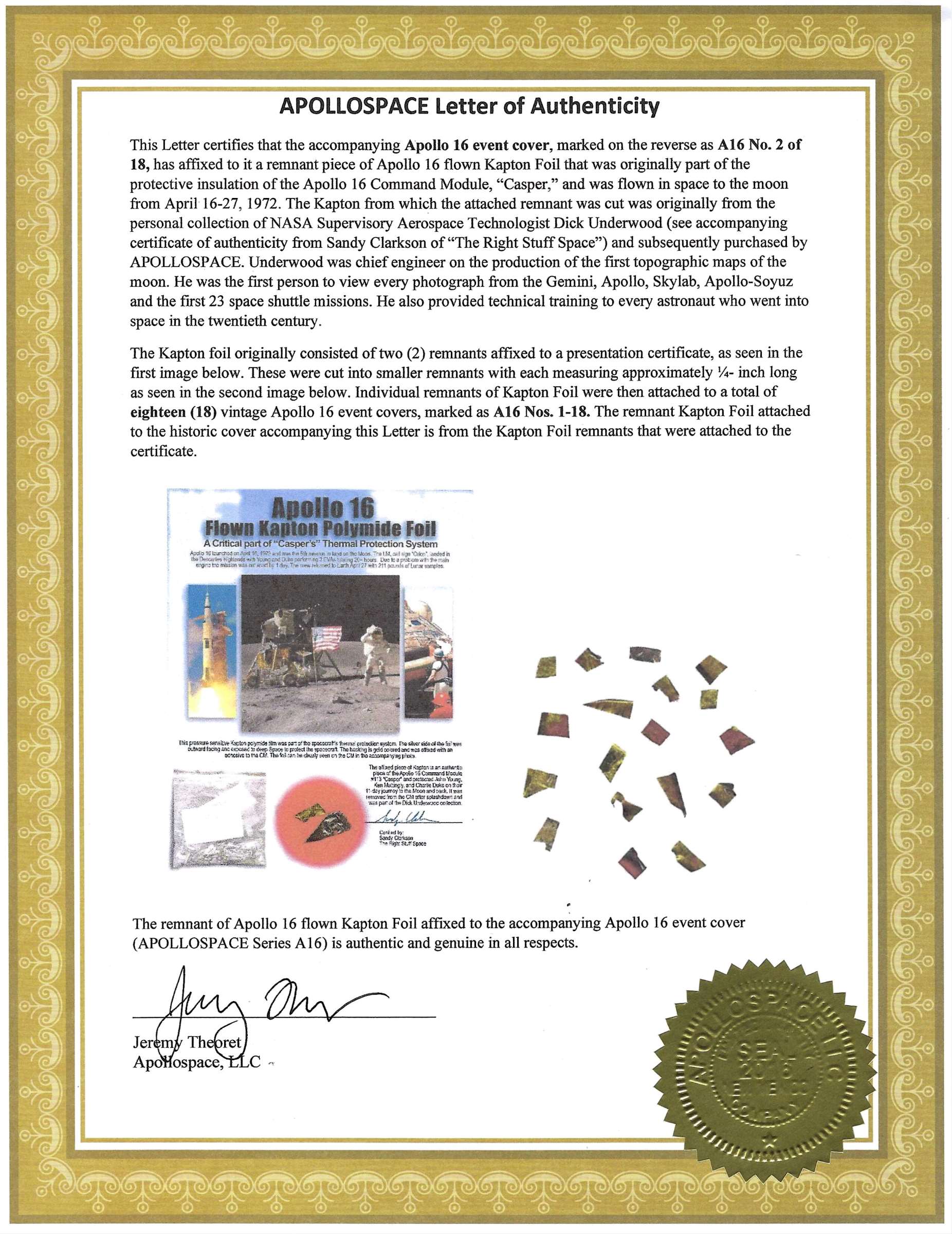 APOLLOSPACE is pleased to offer a collection of Apollo 16 event covers which have been affixed with a remnant piece of Kapton foil that was originally part of the protective insulation of the Apollo 16 Command Module, “Casper,” and was flown in space as part of that spacecraft to the Moon from April 16-27, 1972. The Kapton from which the attached remnant was cut was originally from the personal collection of NASA Supervisory Aerospace Technologist Dick Underwood (see accompanying certificate of authenticity from Sandy Clarkson of “The Right Stuff Space”) and subsequently purchased by APOLLOSPACE. Underwood was chief engineer on the production of the first topographic maps of the moon. He was the first person to view every photograph from the Gemini, Apollo, Skylab, Apollo-Soyuz and the first 23 space shuttle missions. He also provided technical training to every astronaut who went into space in the twentieth century.