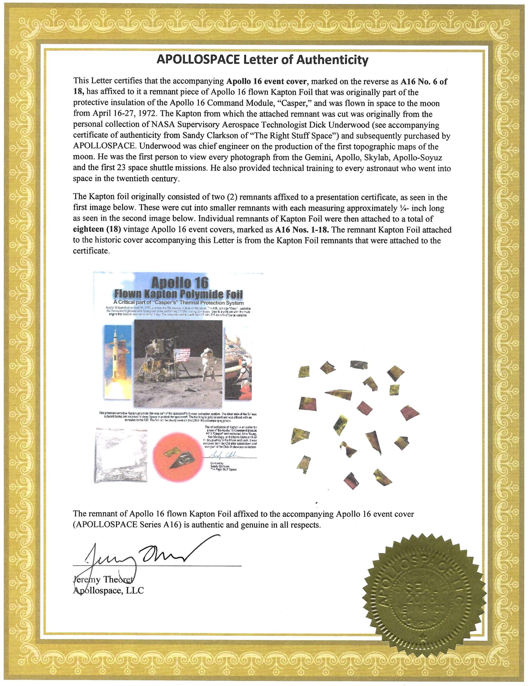APOLLOSPACE is pleased to offer a collection of Apollo 16 event covers which have been affixed with a remnant piece of Kapton foil that was originally part of the protective insulation of the Apollo 16 Command Module, “Casper,” and was flown in space as part of that spacecraft to the Moon from April 16-27, 1972. The Kapton from which the attached remnant was cut was originally from the personal collection of NASA Supervisory Aerospace Technologist Dick Underwood (see accompanying certificate of authenticity from Sandy Clarkson of “The Right Stuff Space”) and subsequently purchased by APOLLOSPACE. Underwood was chief engineer on the production of the first topographic maps of the moon. He was the first person to view every photograph from the Gemini, Apollo, Skylab, Apollo-Soyuz and the first 23 space shuttle missions. He also provided technical training to every astronaut who went into space in the twentieth century.