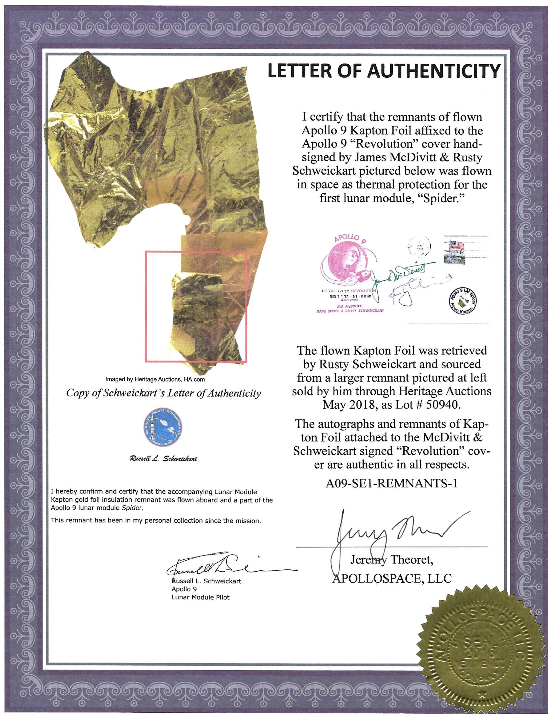 Apollo 9 Jim McDivitt & Rusty Schweickart signed vintage “Revolution” cover with 4 pieces of flown LM Kapton foil from the Apollo 9 Lunar Module, “Spider”. McDivitt & Schweickart were the first astronauts to fly the lunar module, which would later land Apollo 11 on the Moon. This signed cover is authentic in all respects. Kapton foil remnants are from APOLLOSPACE Apollo 9 Flown Kapton Covers (Signed Edition). Largest piece measures approximately 5/16ths inches in length. Cover is in fine condition with light wear and a label stain.