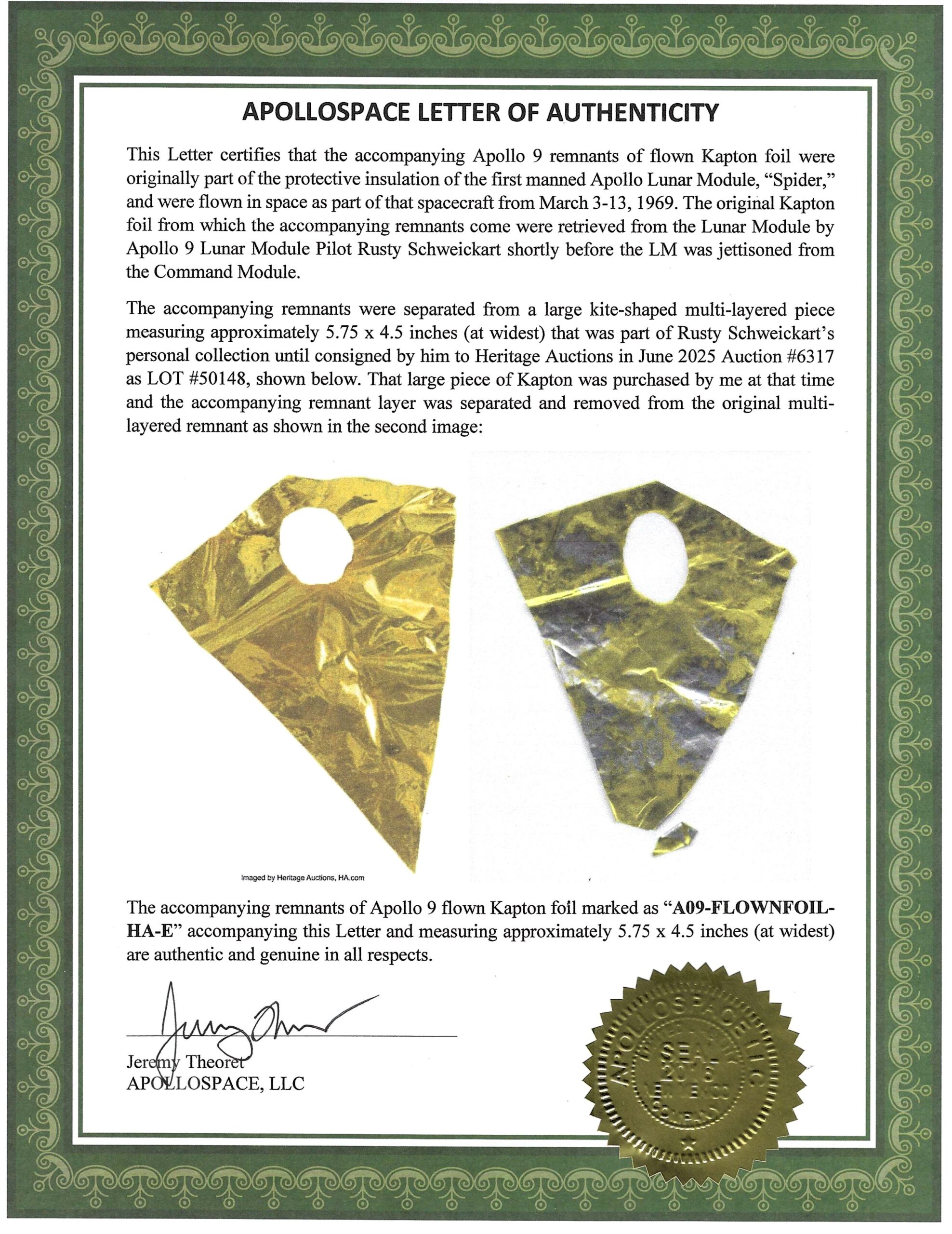 The accompanying remnant of Apollo 9 flown Kapton foil marked as “A09-FLOWNFOIL-HA-D” accompanying this Letter and measuring approximately 5.75 x 4.5 inches (at widest) is authentic and genuine in all respects. A copy of Rusty’s Letter of Authenticity is provided along with an APOLLOSPACE Letter of Authenticity.