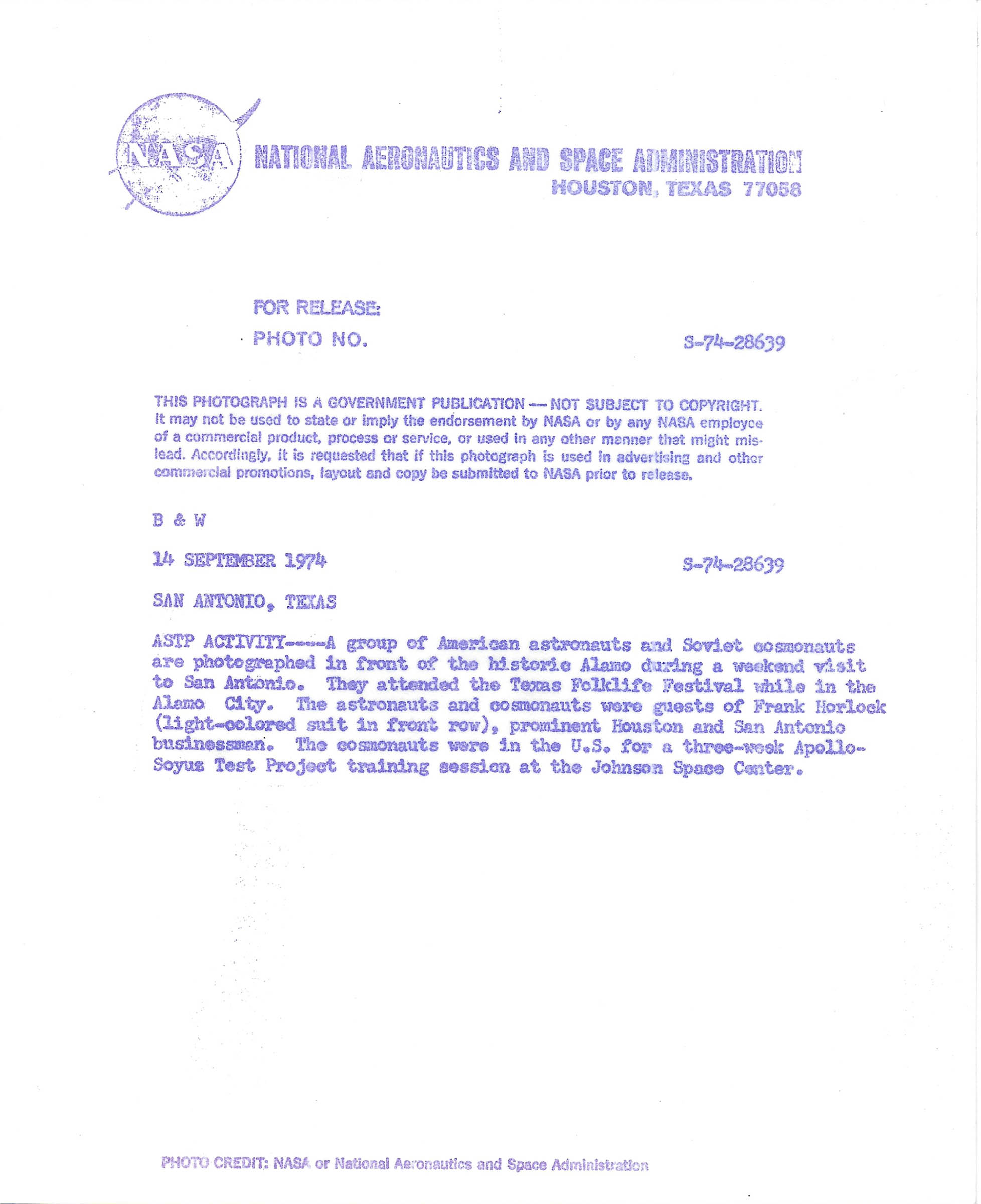 Apollo-Soyuz Test Project (ASTP) Russian and backup crews signed bw 8×10 NASA black # photograph showing cosmonauts and astronauts posing at the Alamo. Signed by Leonov, Kubasov, Filipchenko, Romanenko, Shatalov, Jack Lousma and others. Excellent condition.