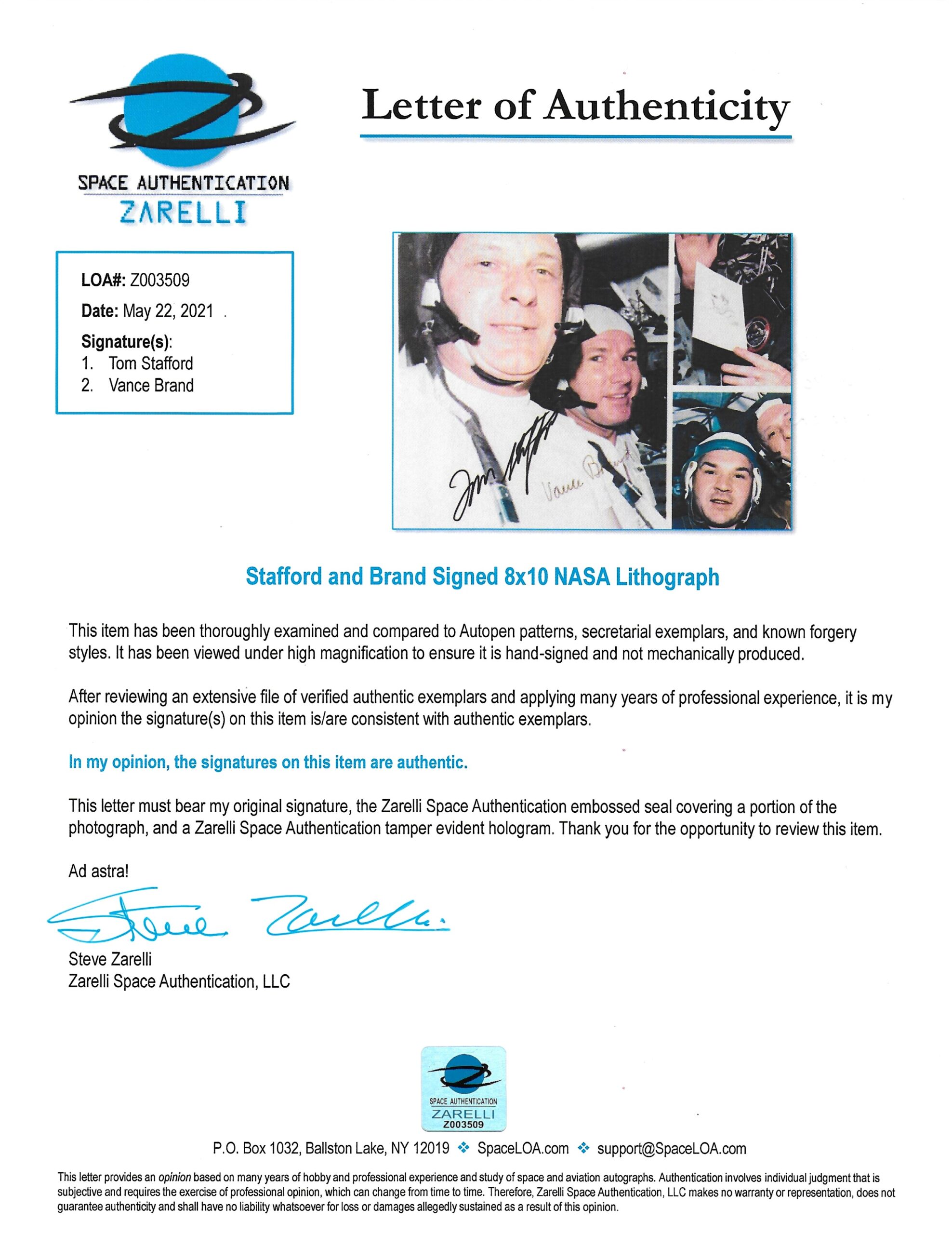 Apollo-Soyuz Test Project (ASTP) Tom Stafford and Vance Brand signed color 8×10 NASA lithograph showing three images from the mission. Stafford and Brand have signed beneath their images. Excellent condition.